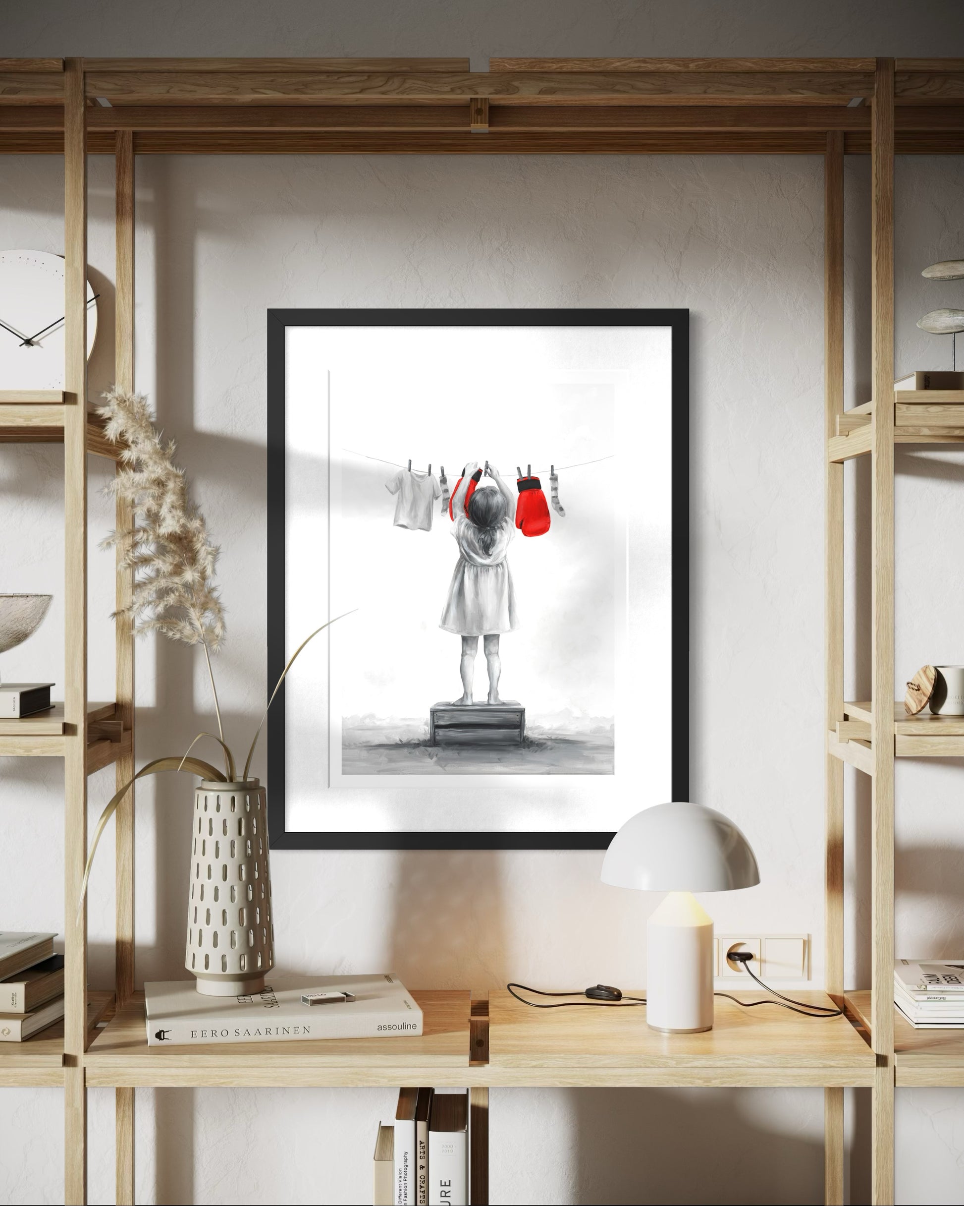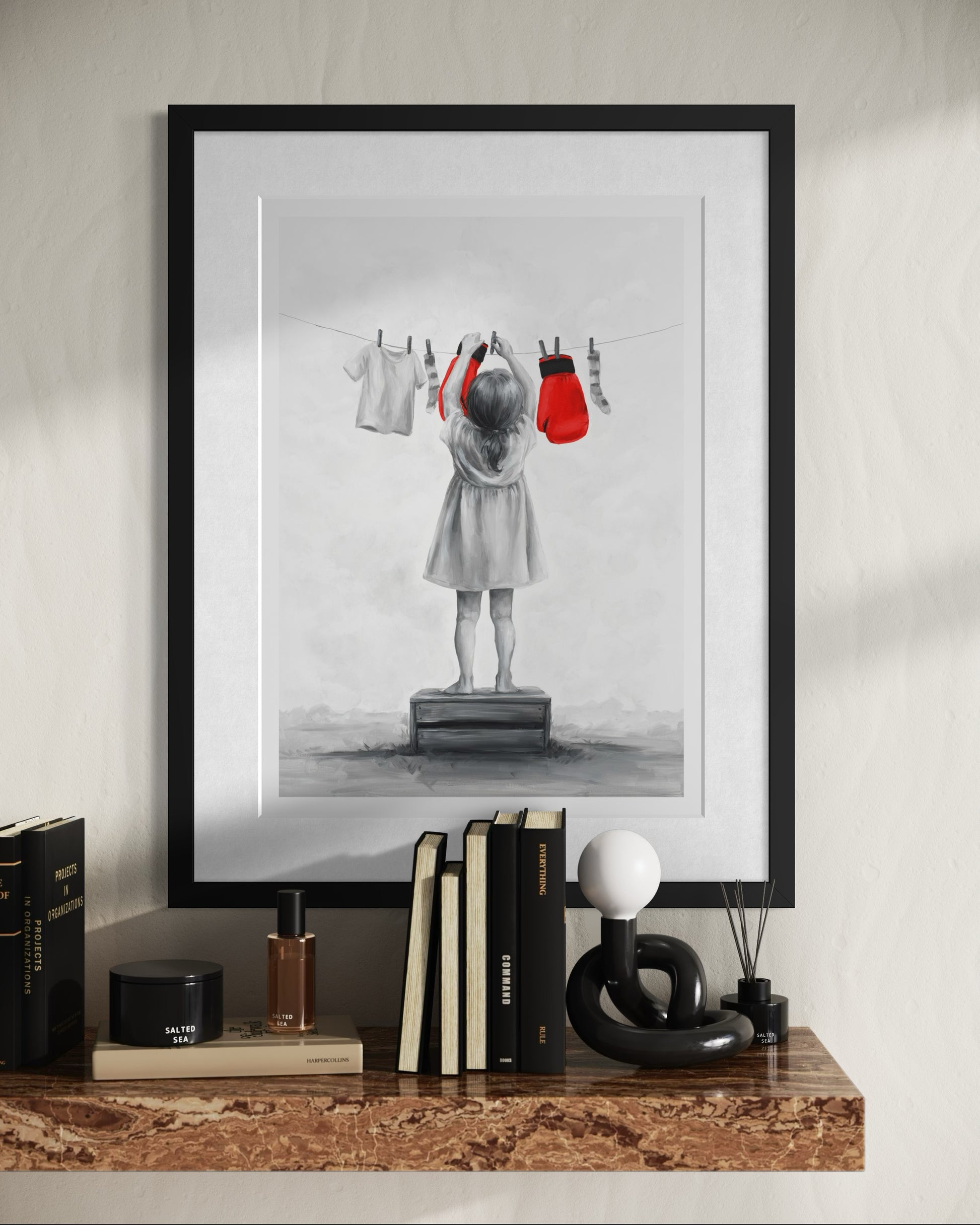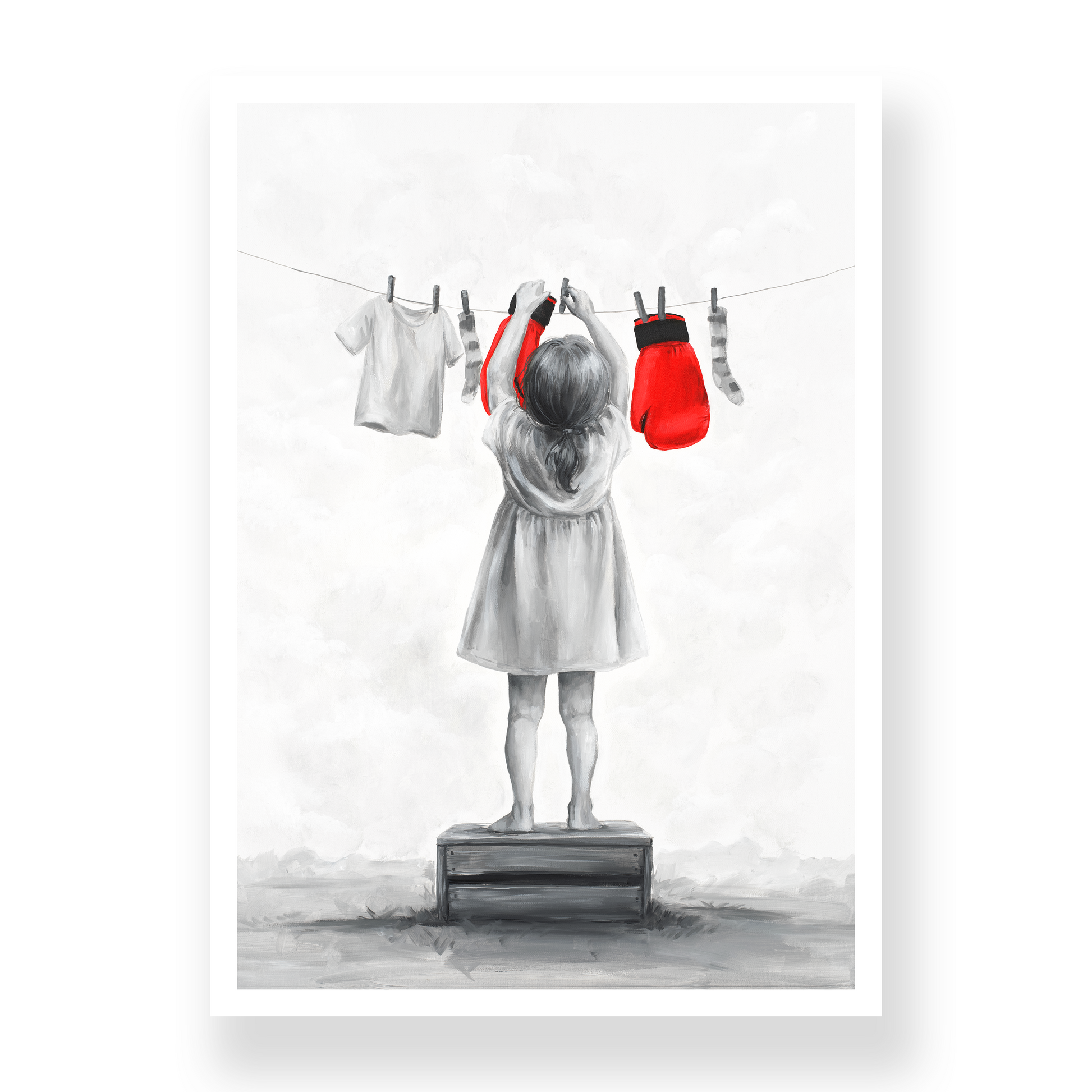 Med ben i nesa, og en boks for å nå opp - henger denne unge jenten opp boksehanskene til tørk.